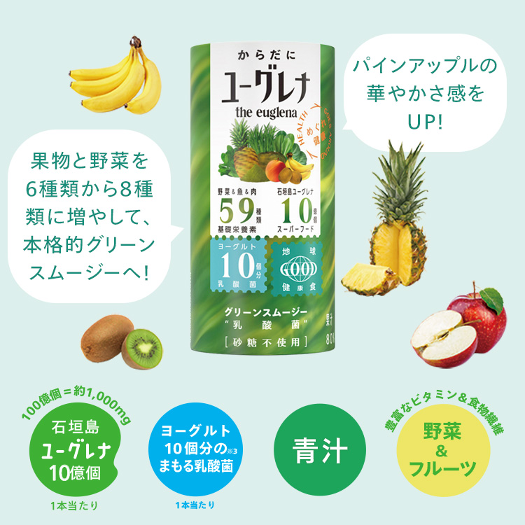 果実(りんご(オーストリア産)、キウイフルーツ、パインアップル、バナナ)野菜(ほうれん草、かぼちゃ、ケール、小松菜)、ユーグレナグラシリス粉末、食物繊維、デキストリン、大麦若葉粉末、乳酸菌(殺菌)/香料、安定剤(増粘多糖類)、クチナシ色素)