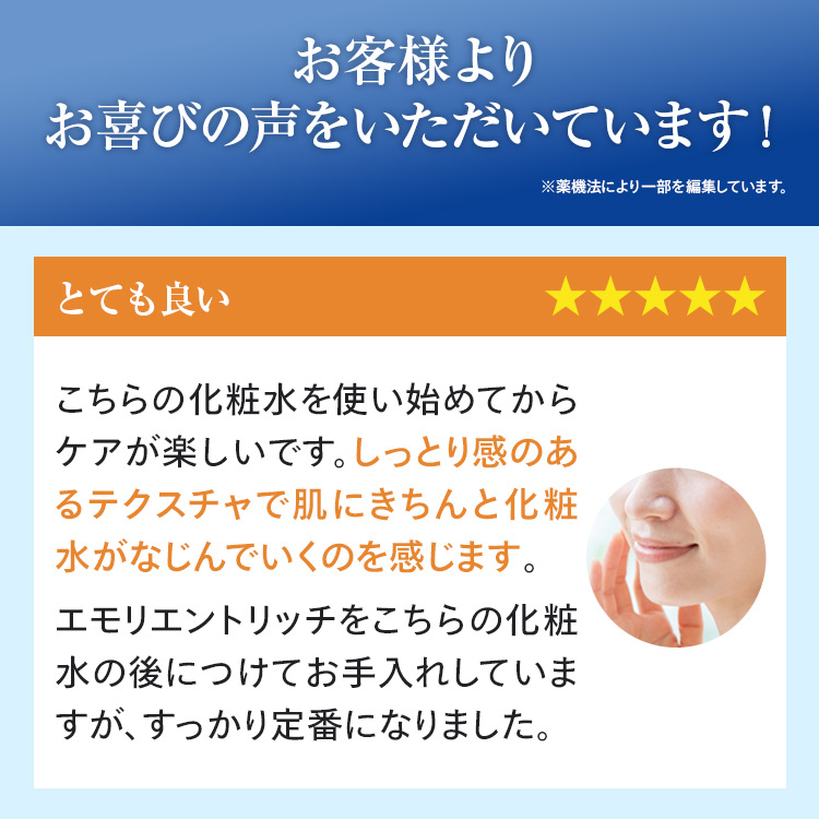 こちらの化粧水を使い始めてからケアが楽しいです。しっとり感のあるテクスチャで肌にきちんと化粧水がなじんでいくのを感じます。エモリエントリッチをこちらの化粧水の後につけてお手入れしていますが、すっかり定番になりました。