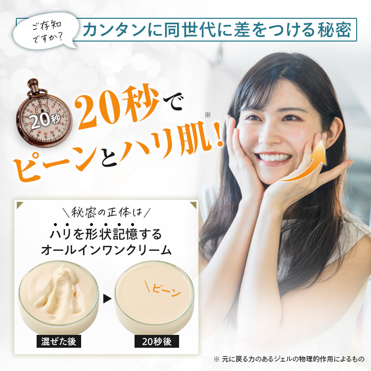 元に戻る力のあるジェルの物理的作用でクリームが20秒で形状記憶!