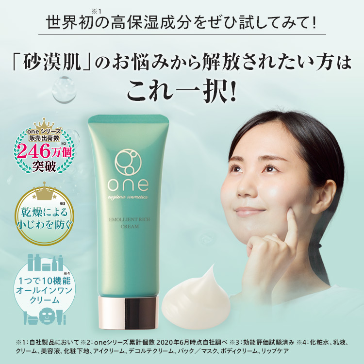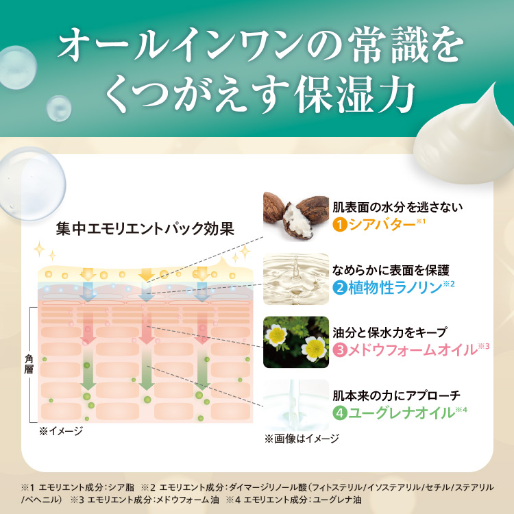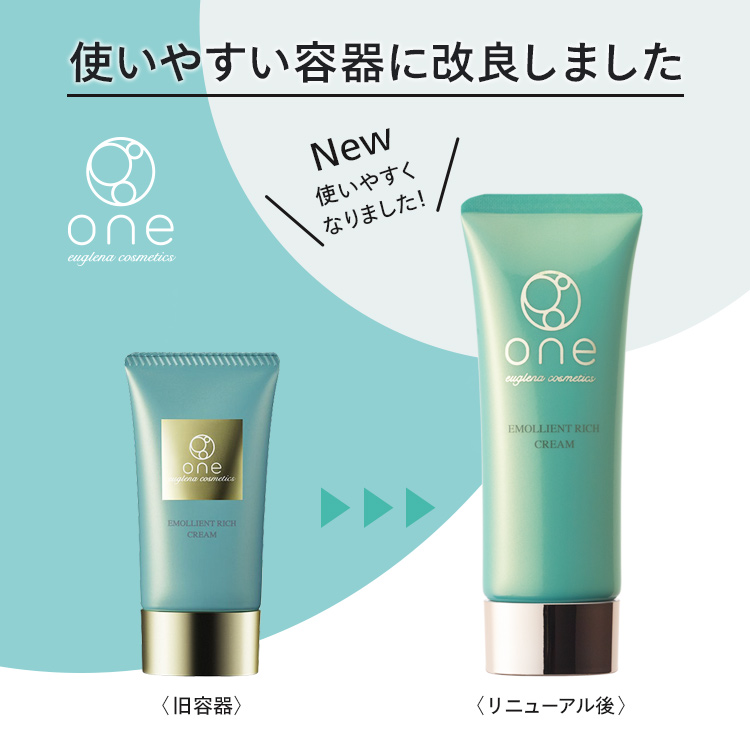 ※1 独自の技術で抽出した「ユーグレナオイル」を、化粧品原料として世界で初めて商品化(自社調べ) ※2 保湿成分:加水分解ユーグレナエキス ※3 自社製品において ※4 エモリエント成分[トリエチルヘキサノイン、ジメチコン、ダイマージリノール酸(フィトステリル/イソステアリル/セチル/ステアリル/ベヘニル)、アラキジルアルコール、ベヘニルアルコール、ステアリン酸グリセリル(SE)、メドウフォーム油、シア脂、ミツロウ、スクワラン、ユーグレナ油] ※5 年齢を重ねた肌 ※6 エモリエント成分:ユーグレナ油