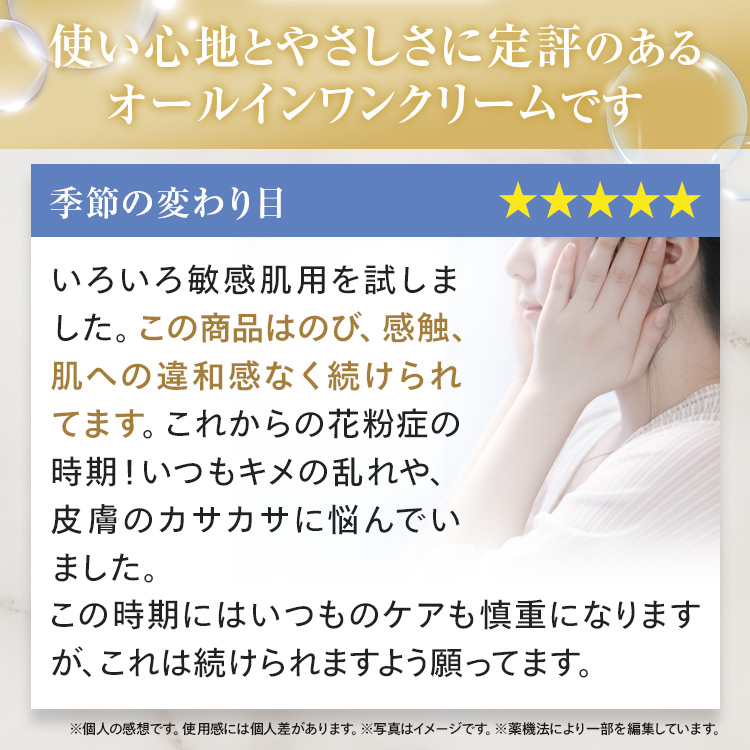 敏感肌ですが、この商品はいつも心地よく長く使用しています。冬場のカサつきや夏場のベタつきは量を加減して上手く対応しています。私の場合、冬場でも40gで1ヶ月くらいはもちます。